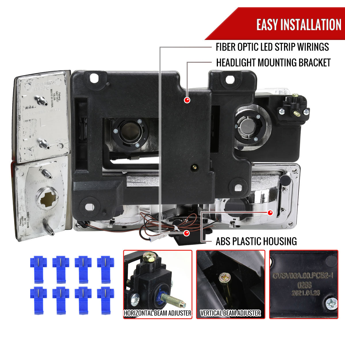 Comes with (1) pair of chrome housing bright white fiber optic LED strip with smoked lens factory headlights with bumper and corner lights with amber reflector included