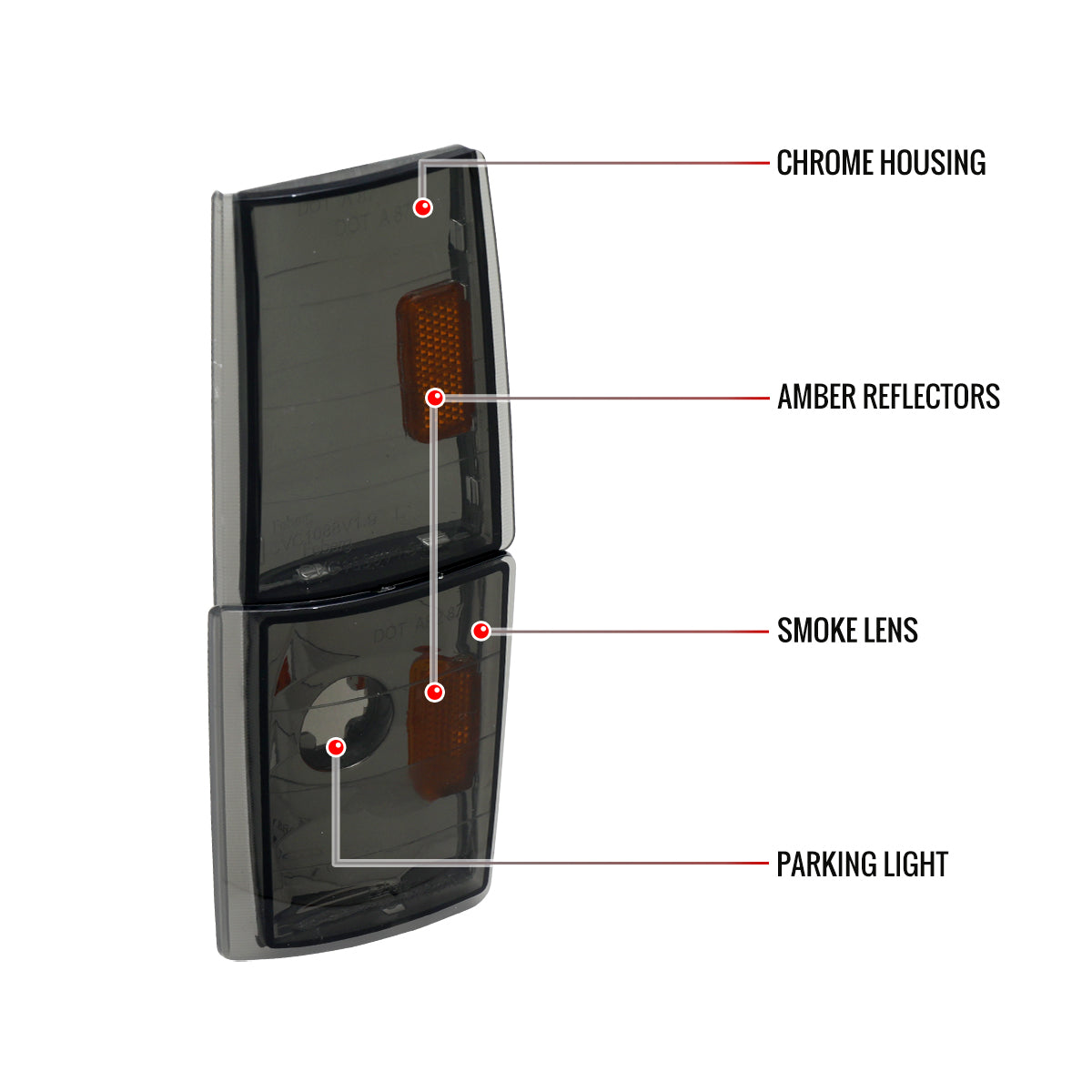 Come with 1 pair chrome housing smoked lens corner lights with amber reflector