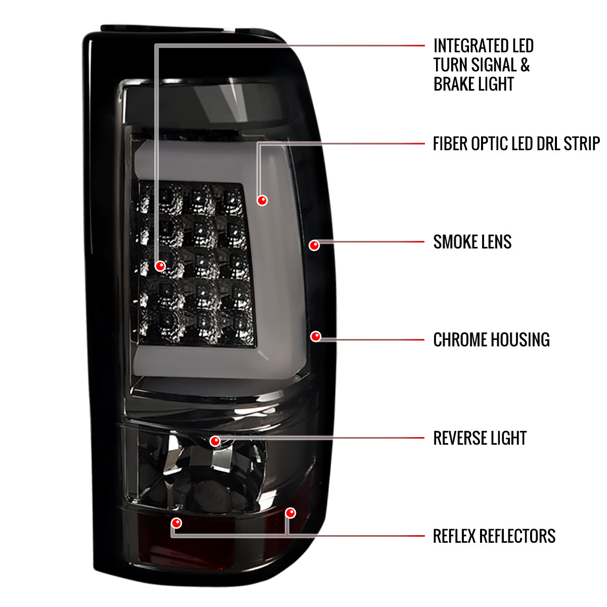 Comes with 1 pair of chrome housing smoked lens tail lights w/ LED bar