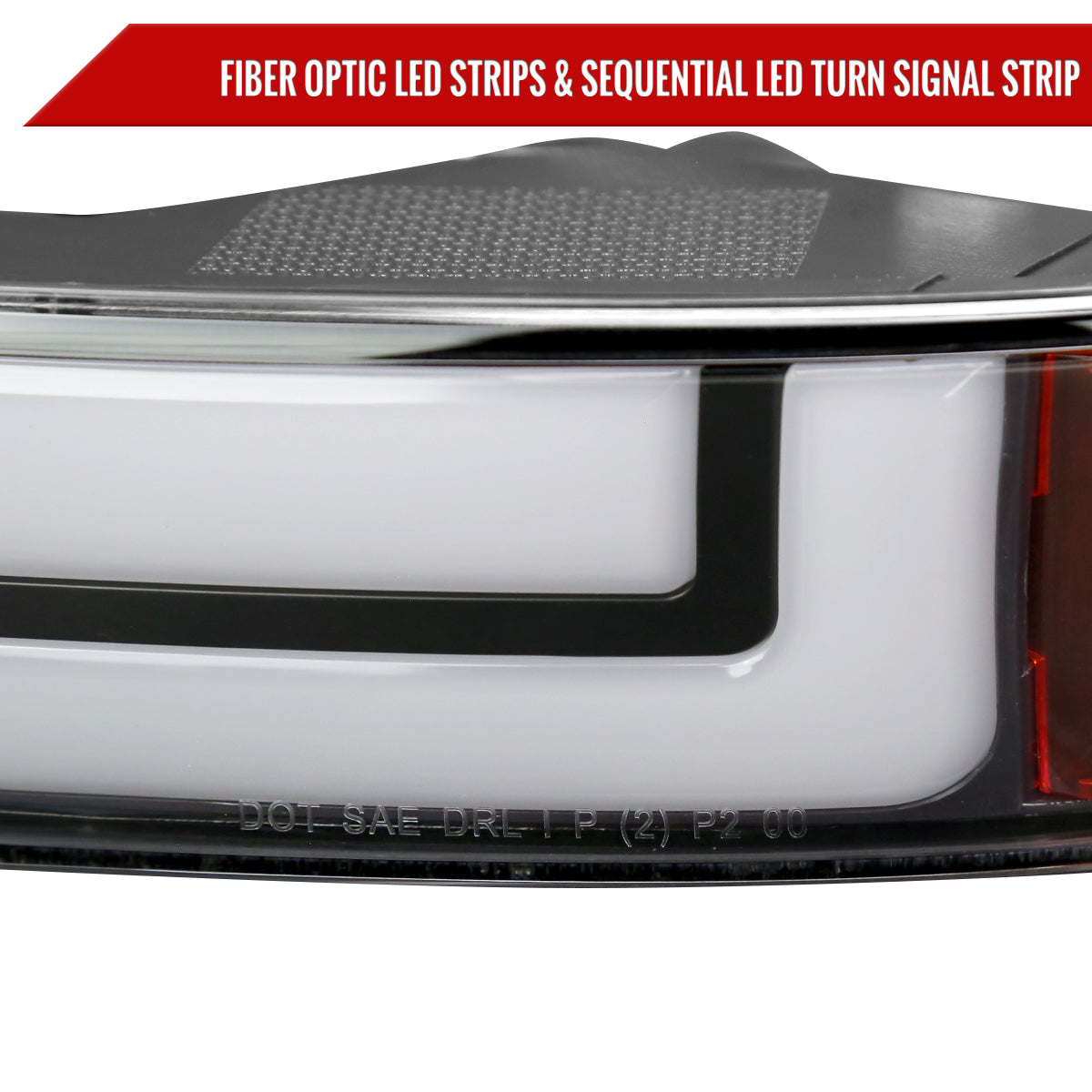 Comes with (1) set of factory style headlights and sequential turn signal bumper lights in matte black housing with clear lens and amber reflector