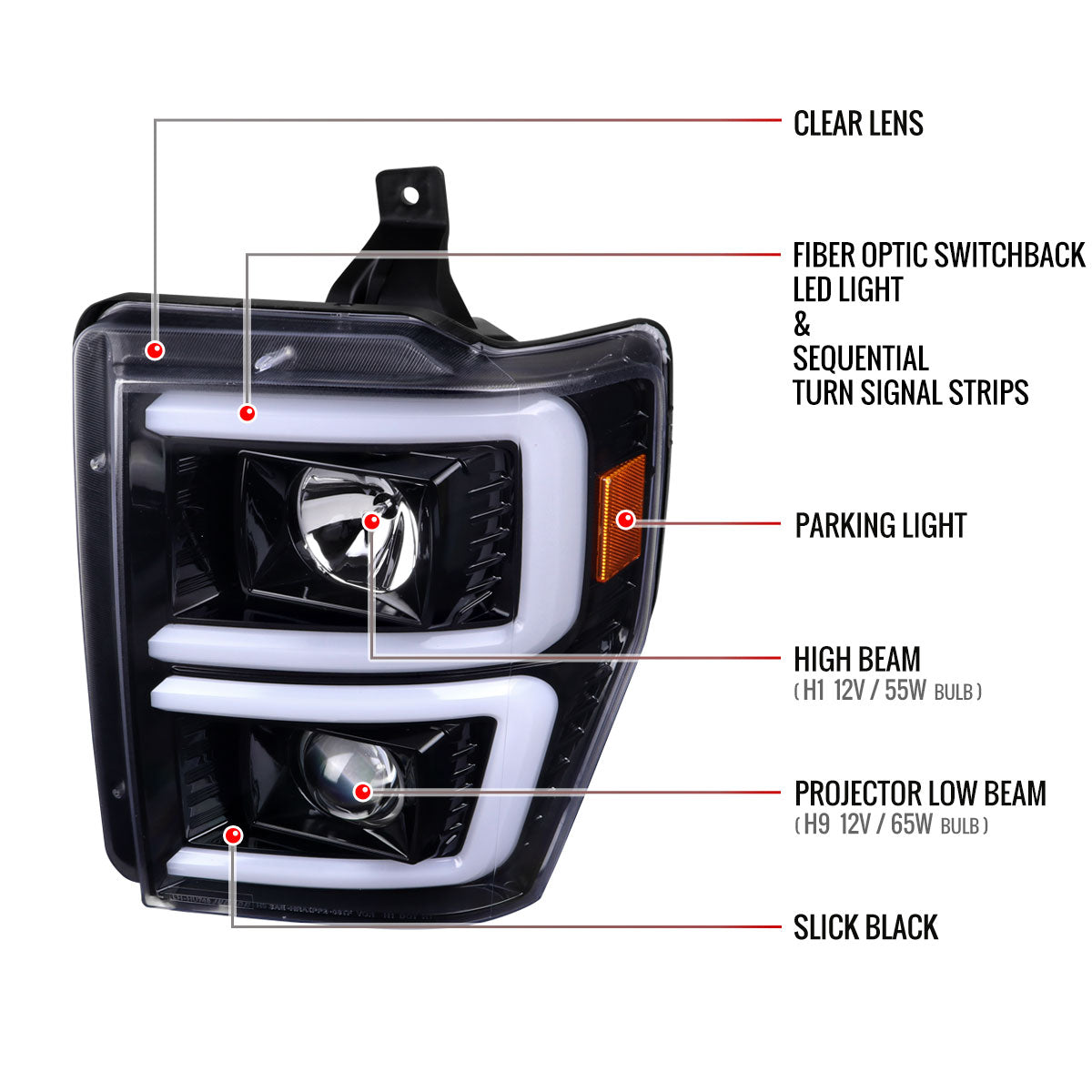 2008-2010 Ford F-250/F-350/F-450/F-550 LED Sequential Turn Signal Bar Projector Headlights (Jet Black Housing/Clear Lens)