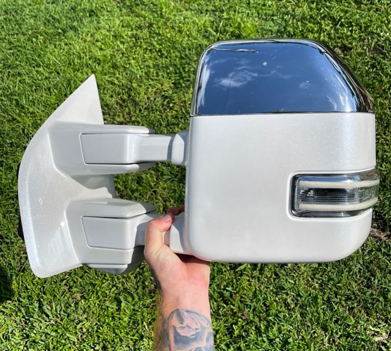 We will disassemble the mirror 100%, sand all of the plastic to a smooth finish, Primer, Color Base coat and Clear each piece and after the pieces are fully cured the mirrors are reassembled ready for re installation on your truck.
