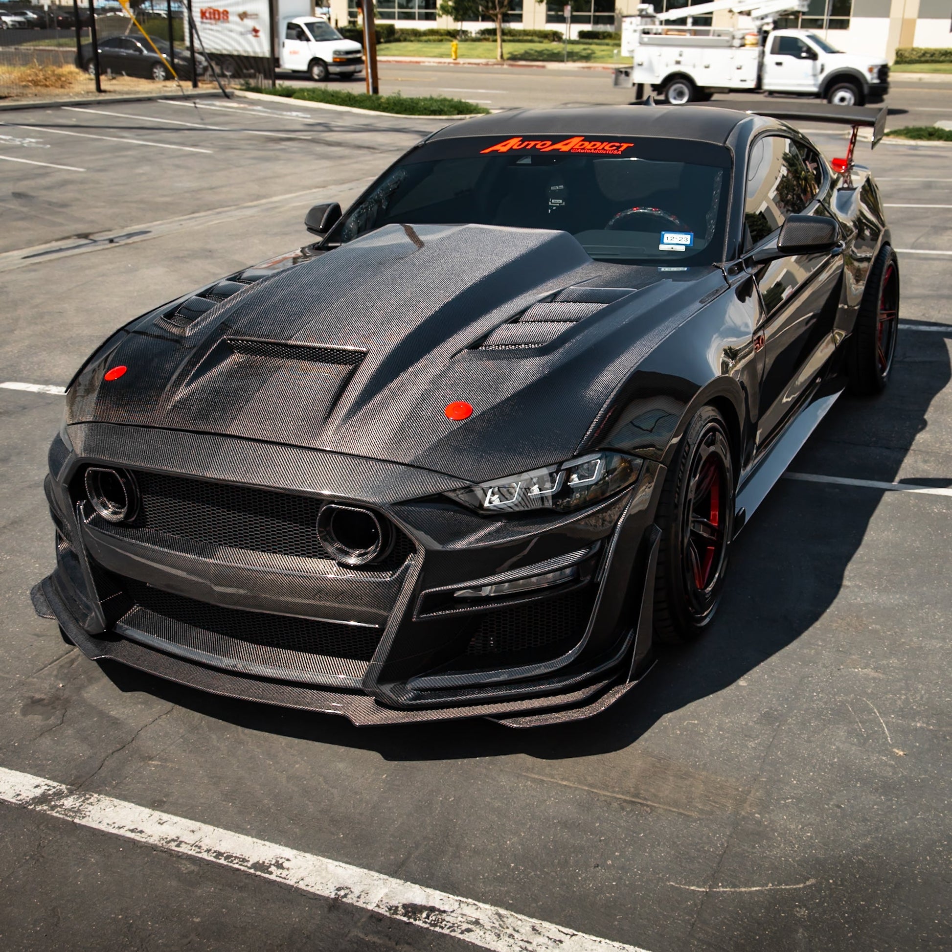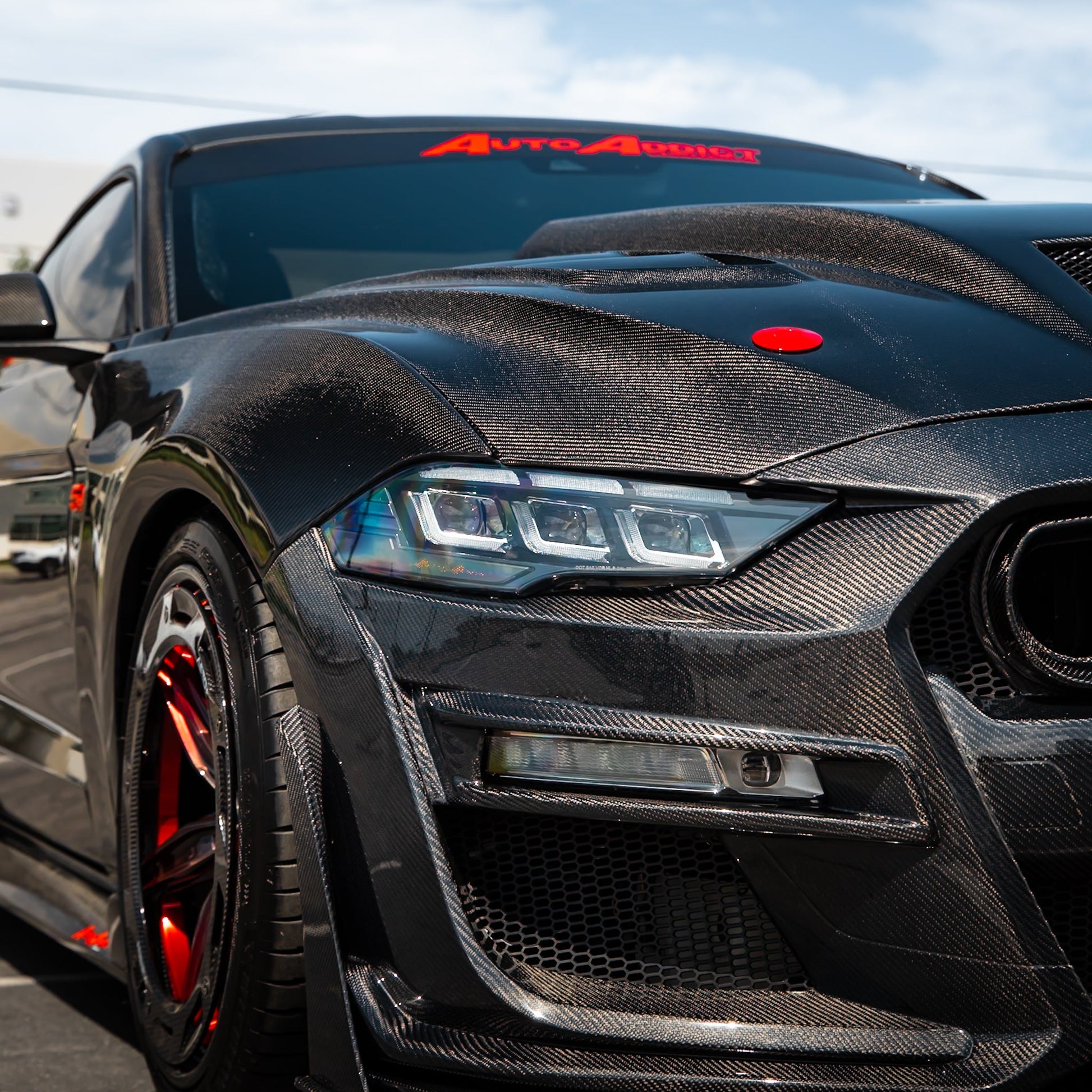 2018–2023 Mustang S550 track kit, GT500 style bumper, Mach 1 halo bumper, carbon fiber rear bumper, S550 carbon rockers, A-side carbon skins, A-pillar carbon overlay, quarter panel carbon overlay, EcoBoost, GT, 13-piece carbon kit.