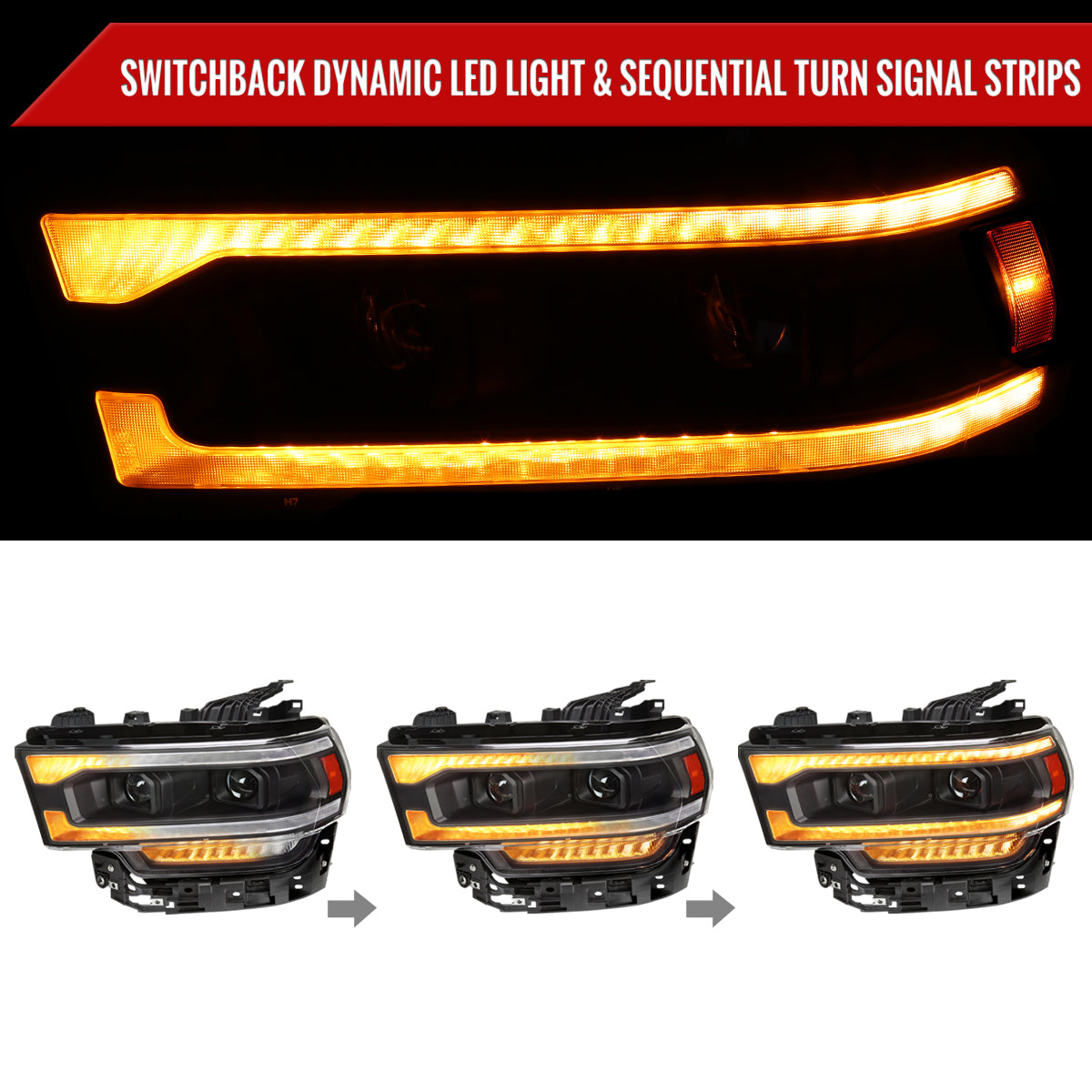 2019-2024 Dodge RAM 2500/3500/4500/5500 Switchback Sequential Amber LED Turn Signal Projector Headlights (Matte Black Housing/Clear Lens)