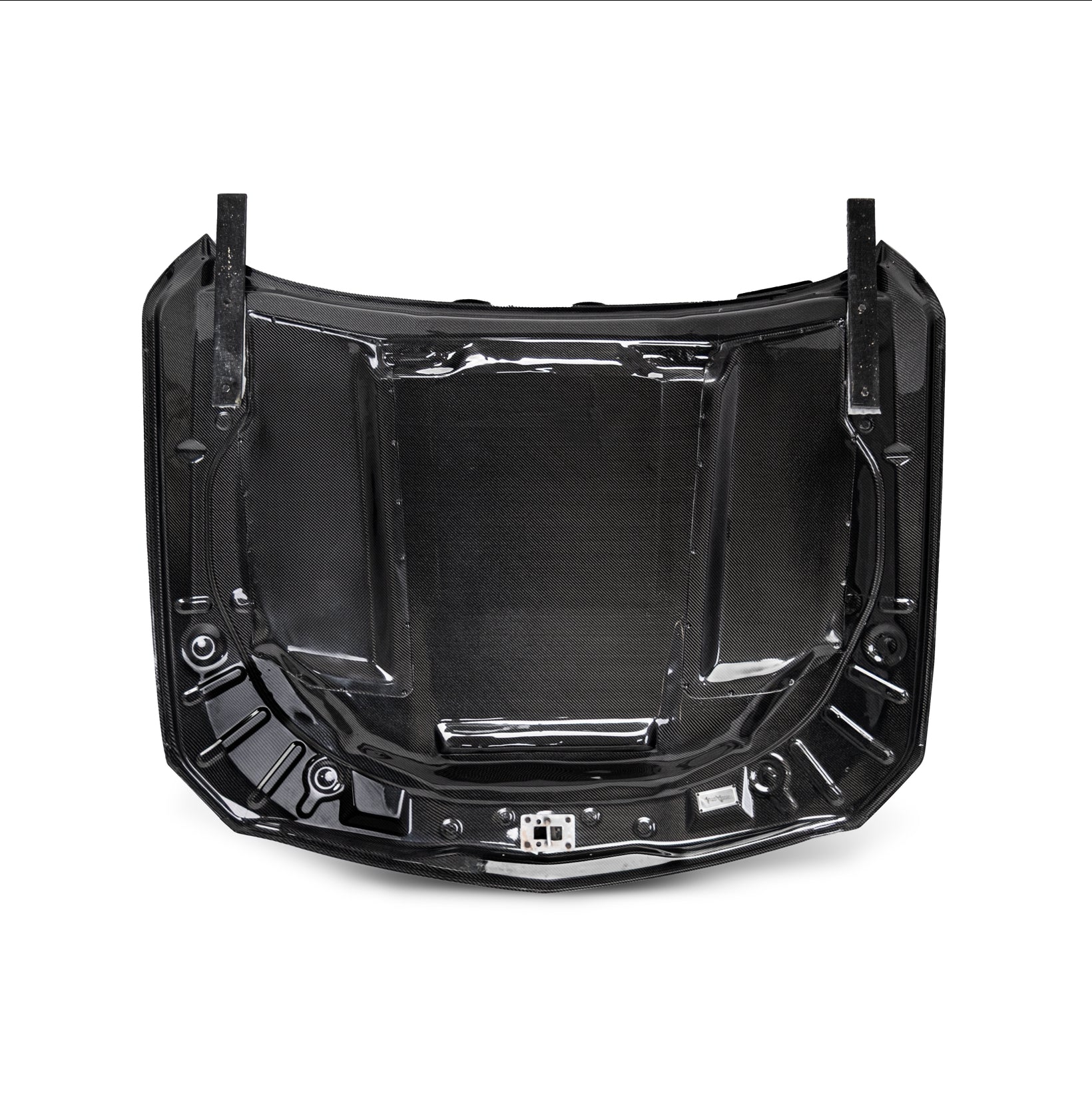 The double-sided carbon fiber construction ensures both the top and underside of the hood feature the same premium finish — making it as stunning under the hood as it is on the outside. Integrated aggressive vents are engineered for optimal airflow and heat extraction, helping to reduce engine bay temperatures while enhancing aerodynamics for improved performance and stability.