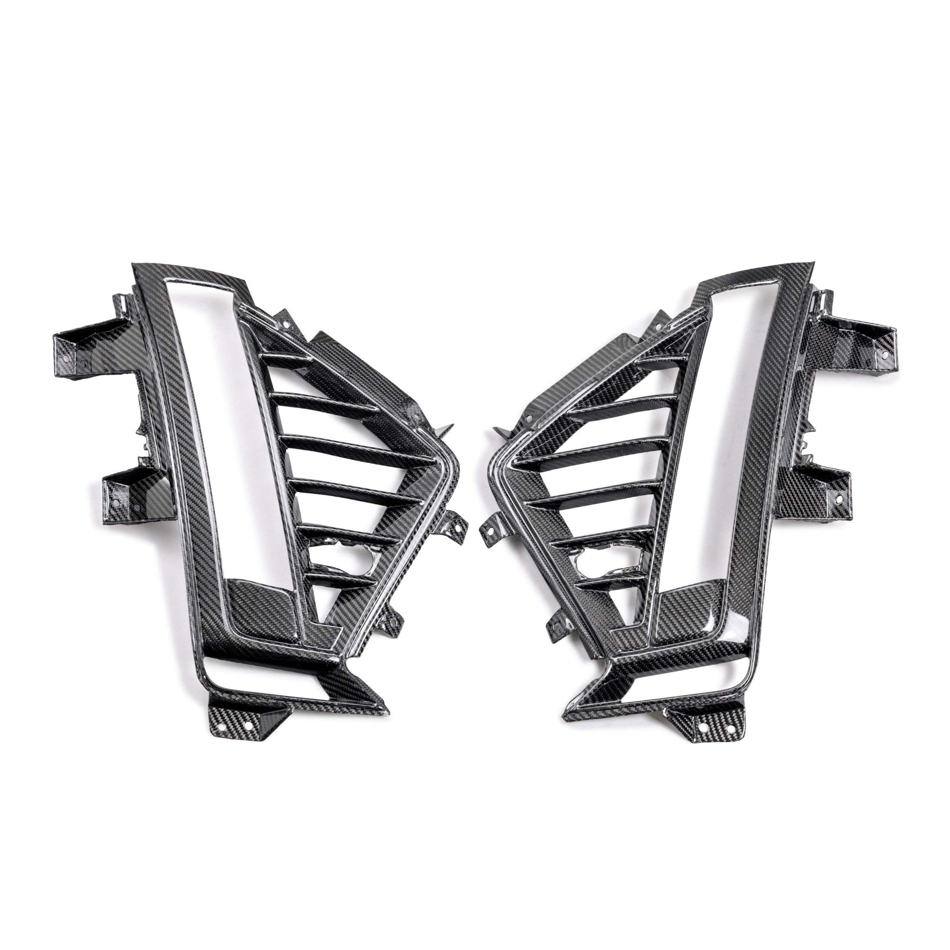 Manufactured using an autoclave process, these carbon fiber side grilles boast a high carbon-to-resin ratio, ensuring exceptional stiffness, durability, and weight reduction. The glossy UV-resistant clear coat finish protects against yellowing and fading, maintaining a deep, high-gloss shine for long-lasting appeal.