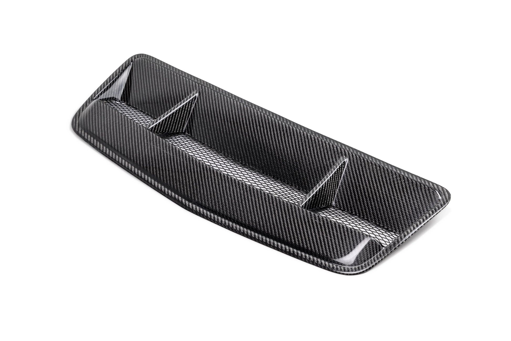 *Large opening for increased heat extraction, wire mesh inserts*Replaces OE Mustang hood vent*Vacuum infused process with 3K, 2x2 twill carbon fiber cloth, gloss finish*Mounts with threaded studs and nuts in OE mounting location
