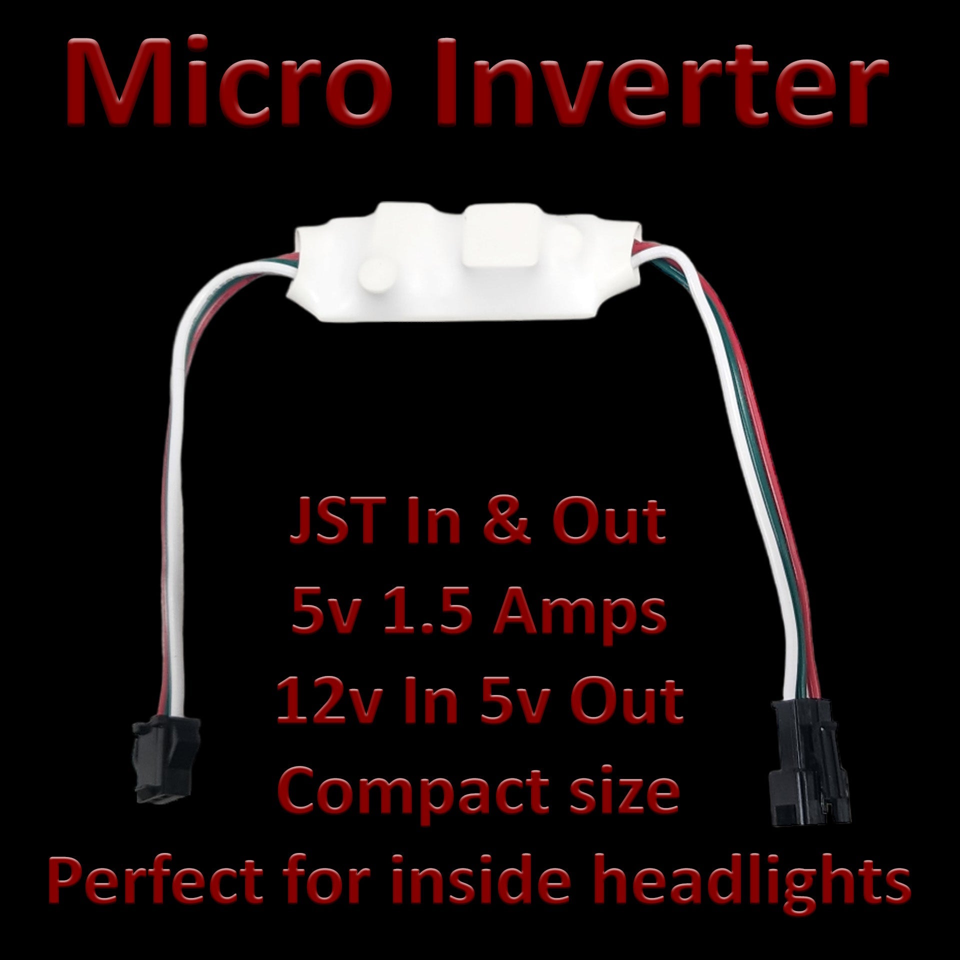 Introducing the pinnacle of convenient and efficient LED powering: our 5V 1.5A Micro Inverter. Is designed with the SK6812RGBW LEDs in mind, it flawlessly powers up to 100 LEDs – making it ideal for setups with as much as three 80mm halos. Say goodbye to soldering, with our JST quick connects that promise an easy, solder-free installation. Encased in a durable shrink tubing sleeve, this inverter ensures safety and longevity while maintaining its compact footprint.