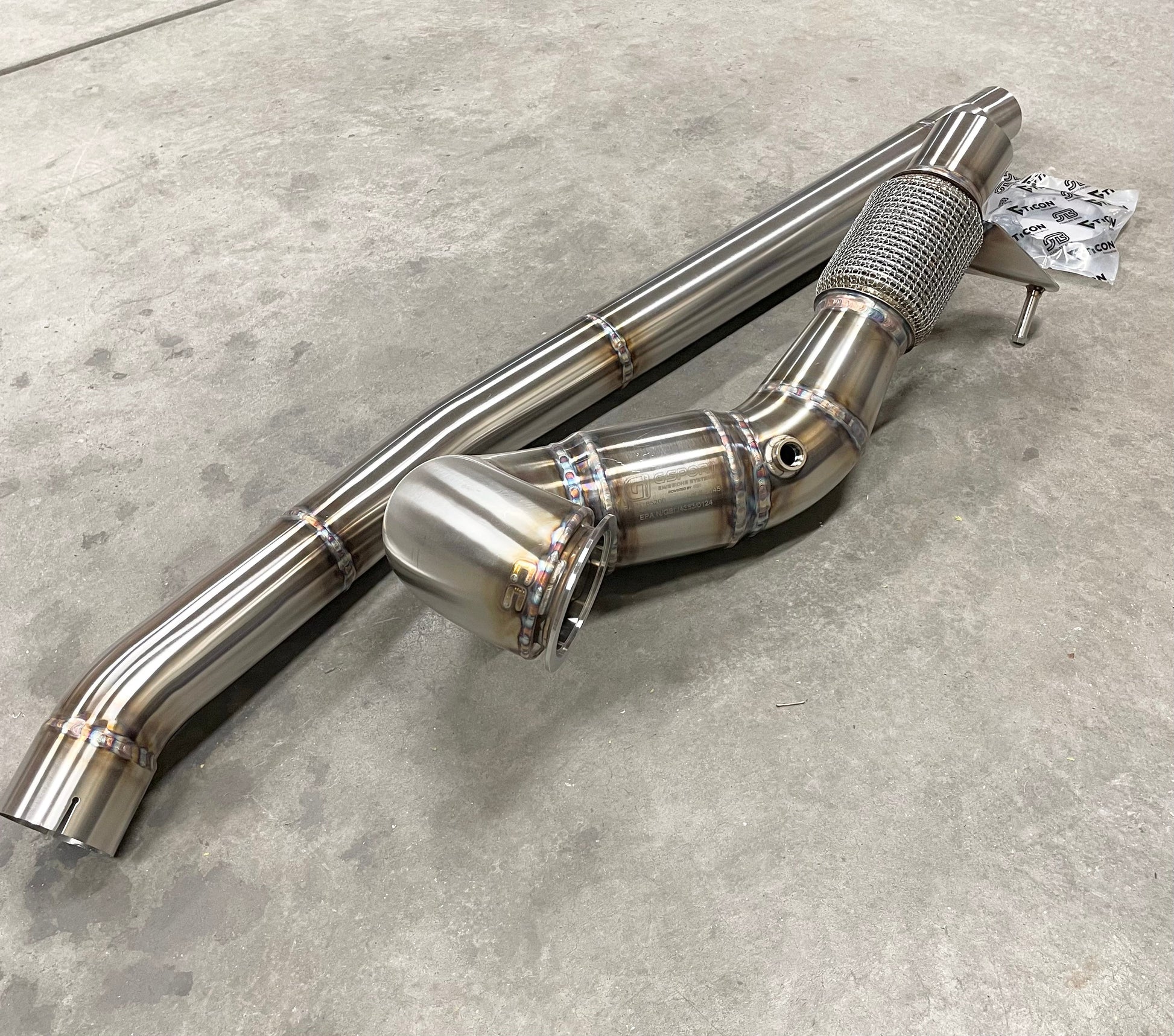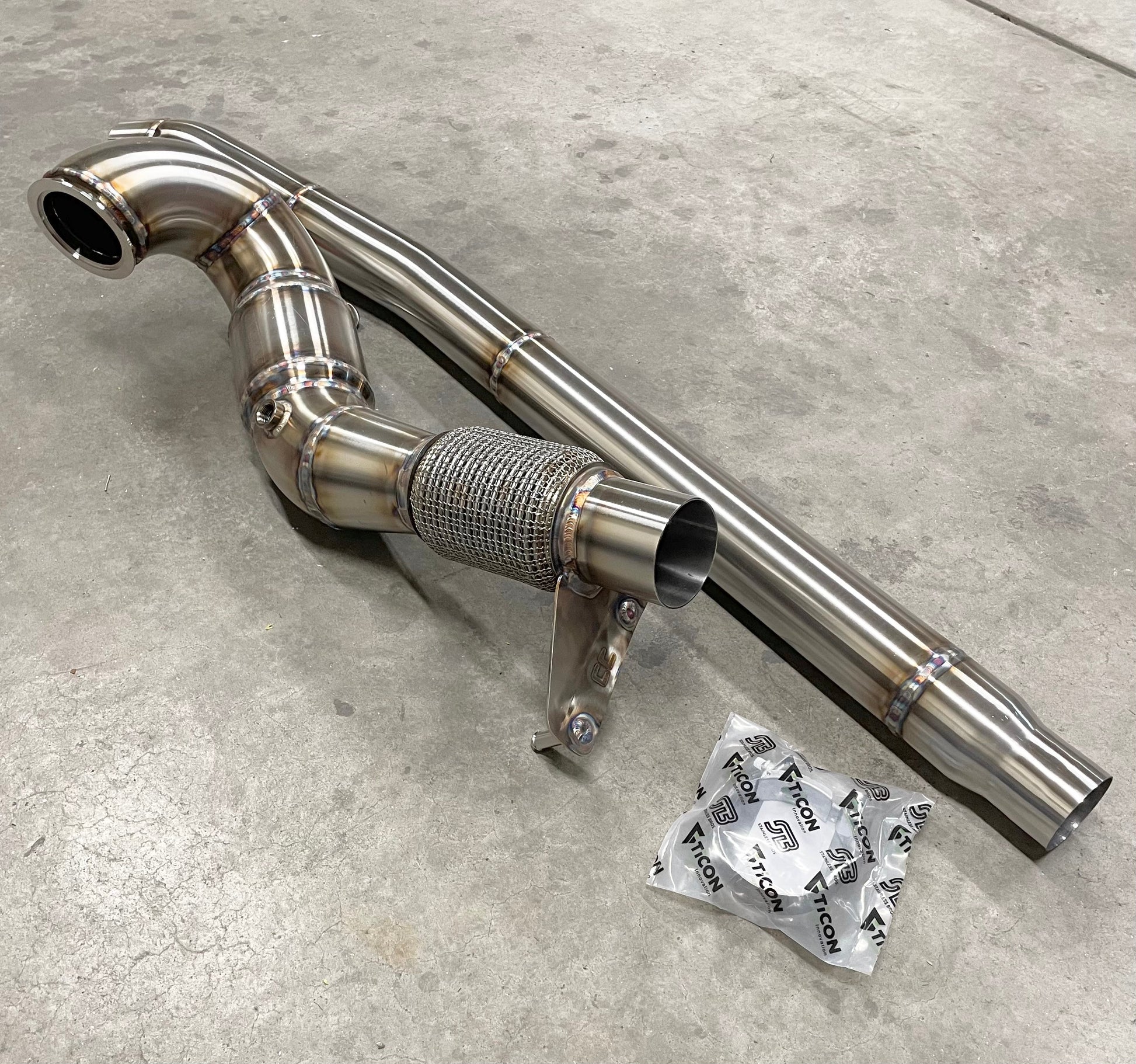 This downpipe for the AWD MQB platform features a 4" entry that contours down to 3" at the flex section for the rest of the way back.