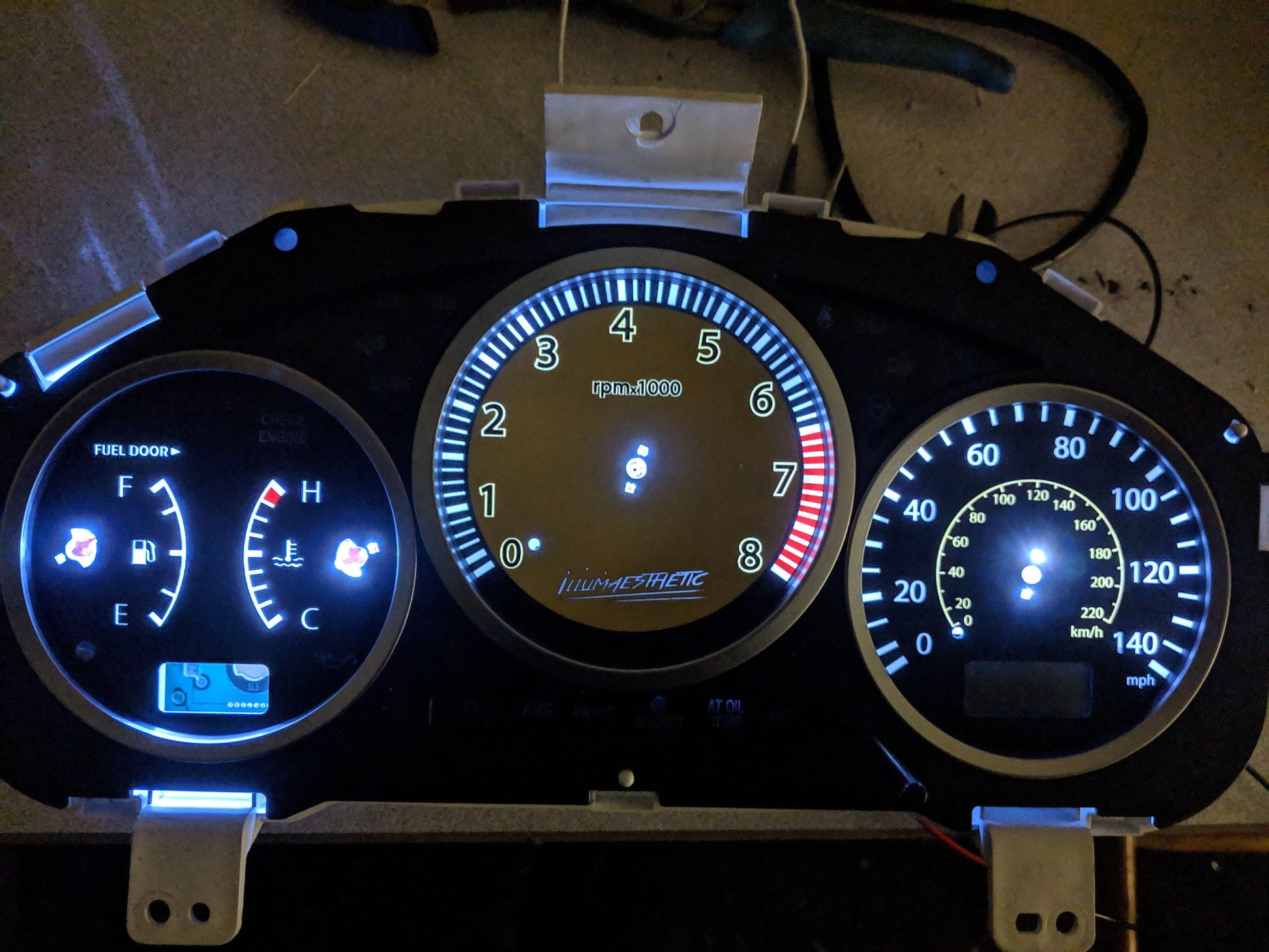This not a full gauge cluster replacement. A whole gauge cluster is not included in this product. These are full plastic replacements for the original gauge faces. The cluster needs to be removed and disassembled in order to install the new gauge faces. The "night time Lighting effect" of our gauge faces are designed to work with white T5 1210 LED's. These are not included in the kit. We recommend you purchase them separately through other vendors to the achieve maximum effect of a custom gauge cluster face. Any design changes from any pre-designed gauge face will be considered a custom order. Please refer below.