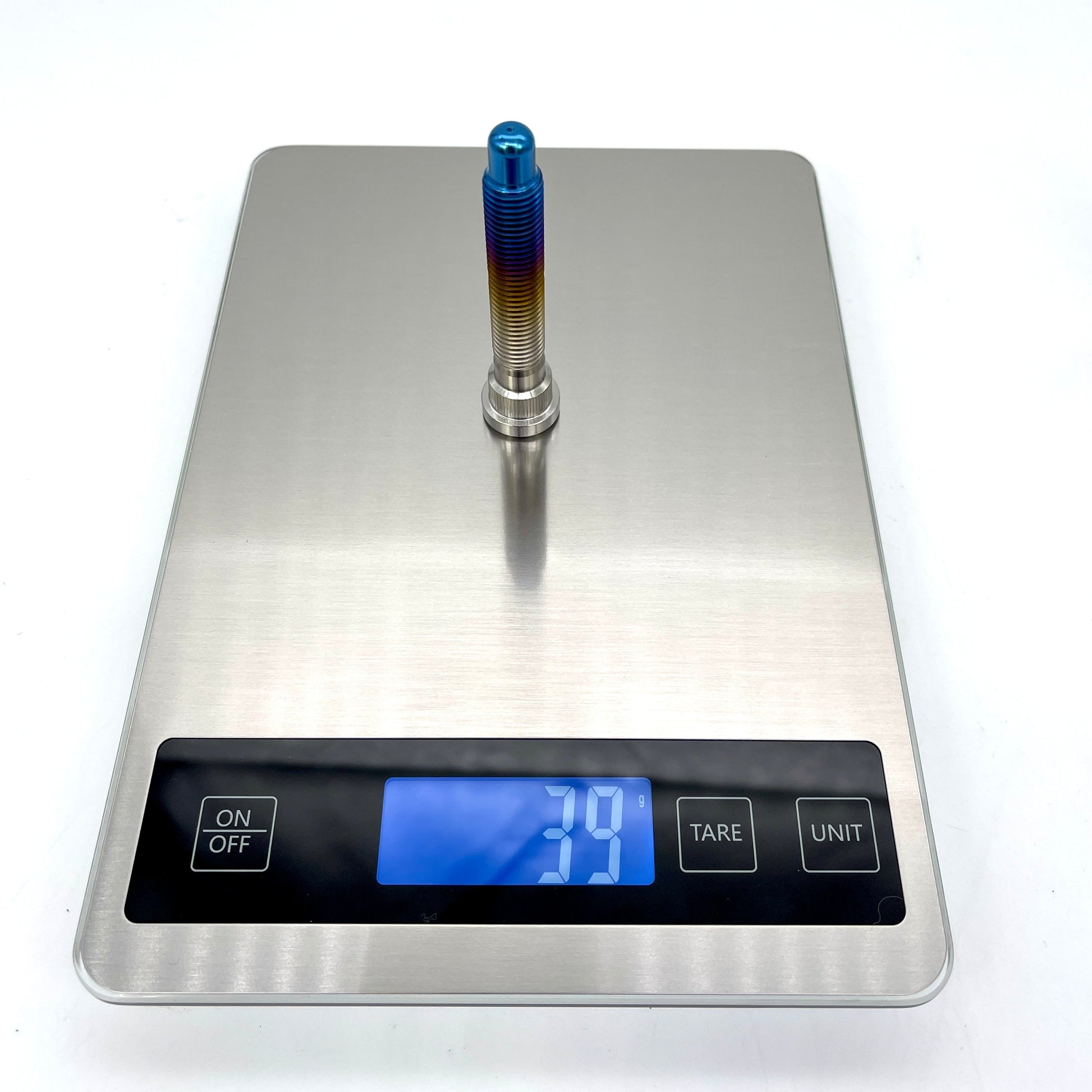 JDC titanium wheel studs are a great addition for the true titanium addict! Each stud is CNC machined from a solid piece of super-strong Ti6Al-4V (Grade 5) and weighs only 39 grams! Extended studs are a must-have for anyone running thick spacers and the JDC titanium studs will save you 600 grams (~1.5lbs) over other steel studs on the market.