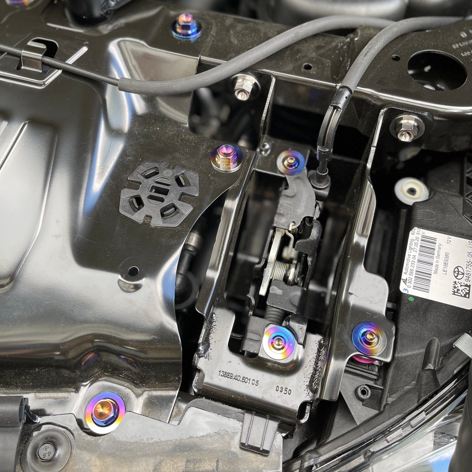 The JDC Titanium hood latch hardware kit replaces the hardware that secures hood latch mechanisms to the frame. You will need to pull back the plastic shield on each side to access one of the bolts. Each piece is hand polished before receiving our proprietary anodizing process, which gives it the long-lasting vibrant colors we're known for! Select your option from the drop-down menu.