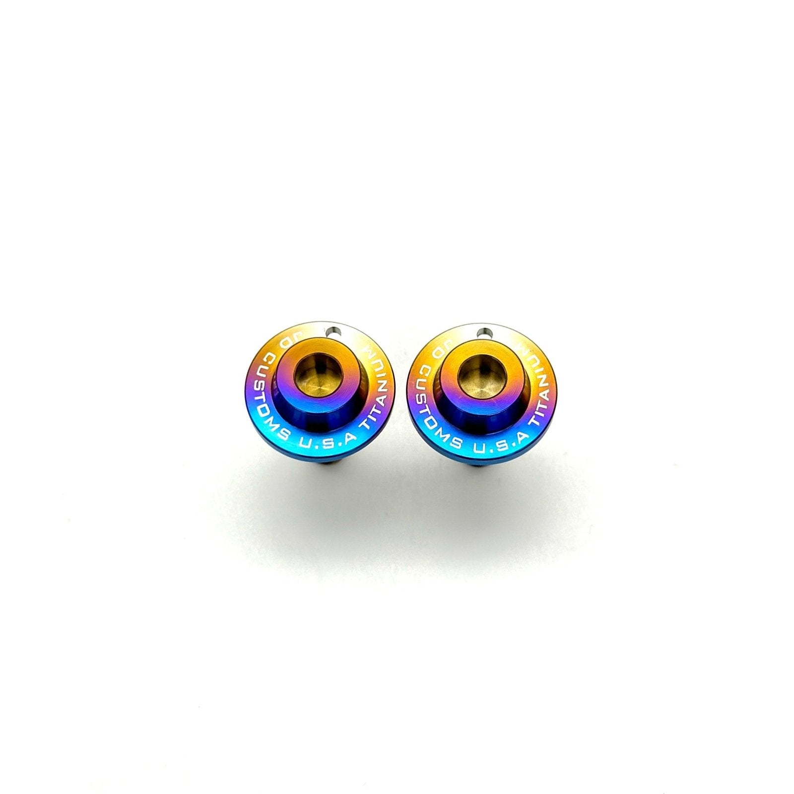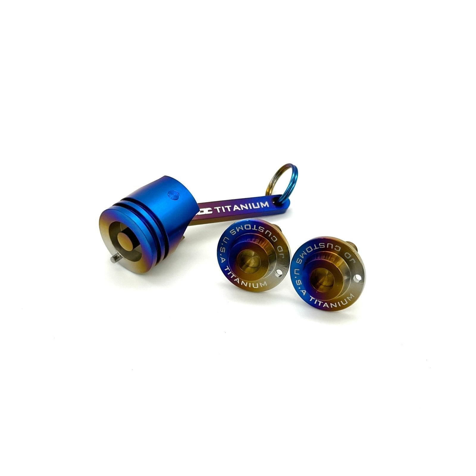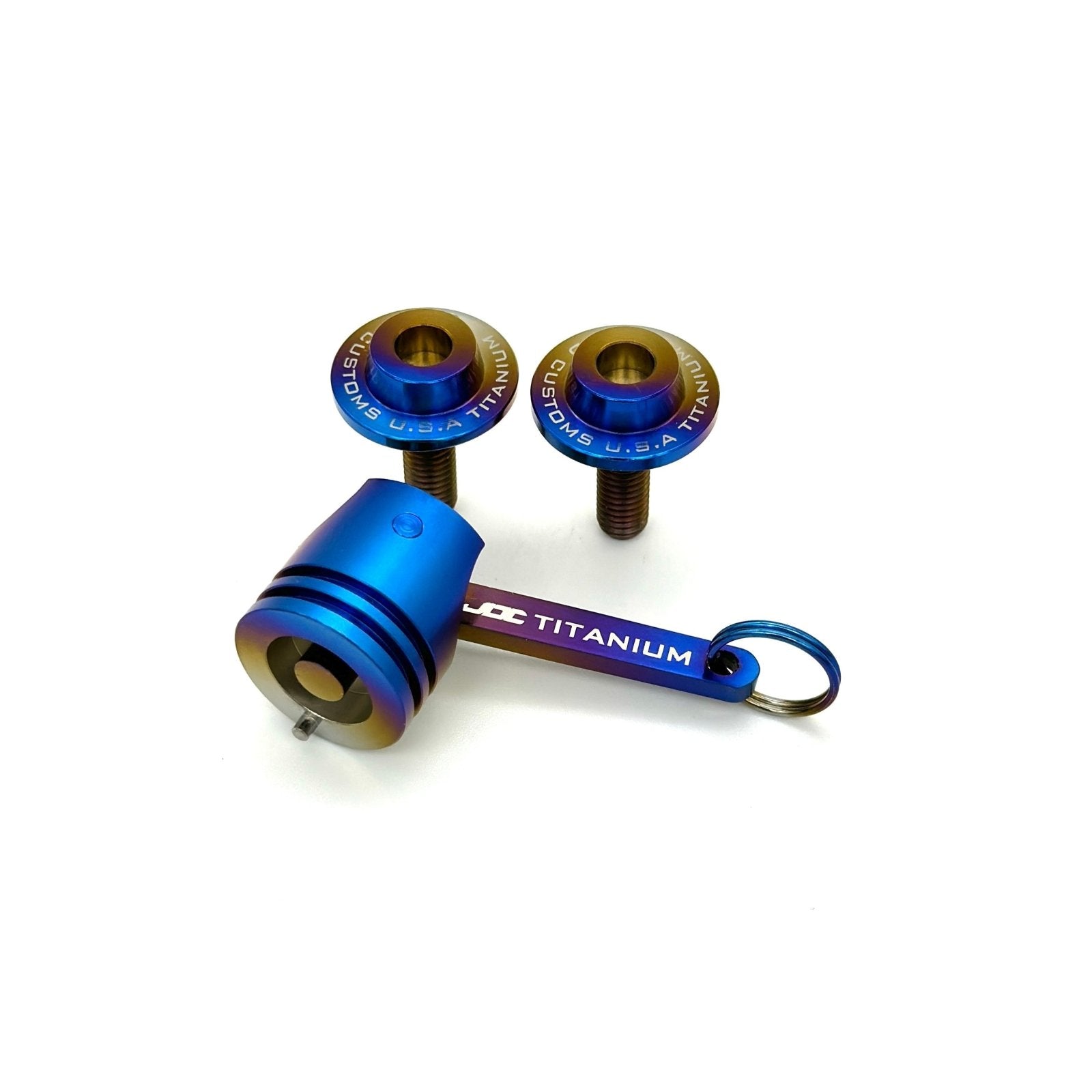 Secure your peace of mind with the JDC Titanium Locking License Plate Mounting Kit. This top-of-the-line kit includes two ultra-secure titanium locking bolts and a unique, piston-shaped solid titanium keychain that also serves as the exclusive key for bolt removal. Engineered for ultimate security, these bolts can't be removed by any tool other than the provided keychain. Say goodbye to worries about license plate theft—your car's hardware is now as safe as it is stylish!