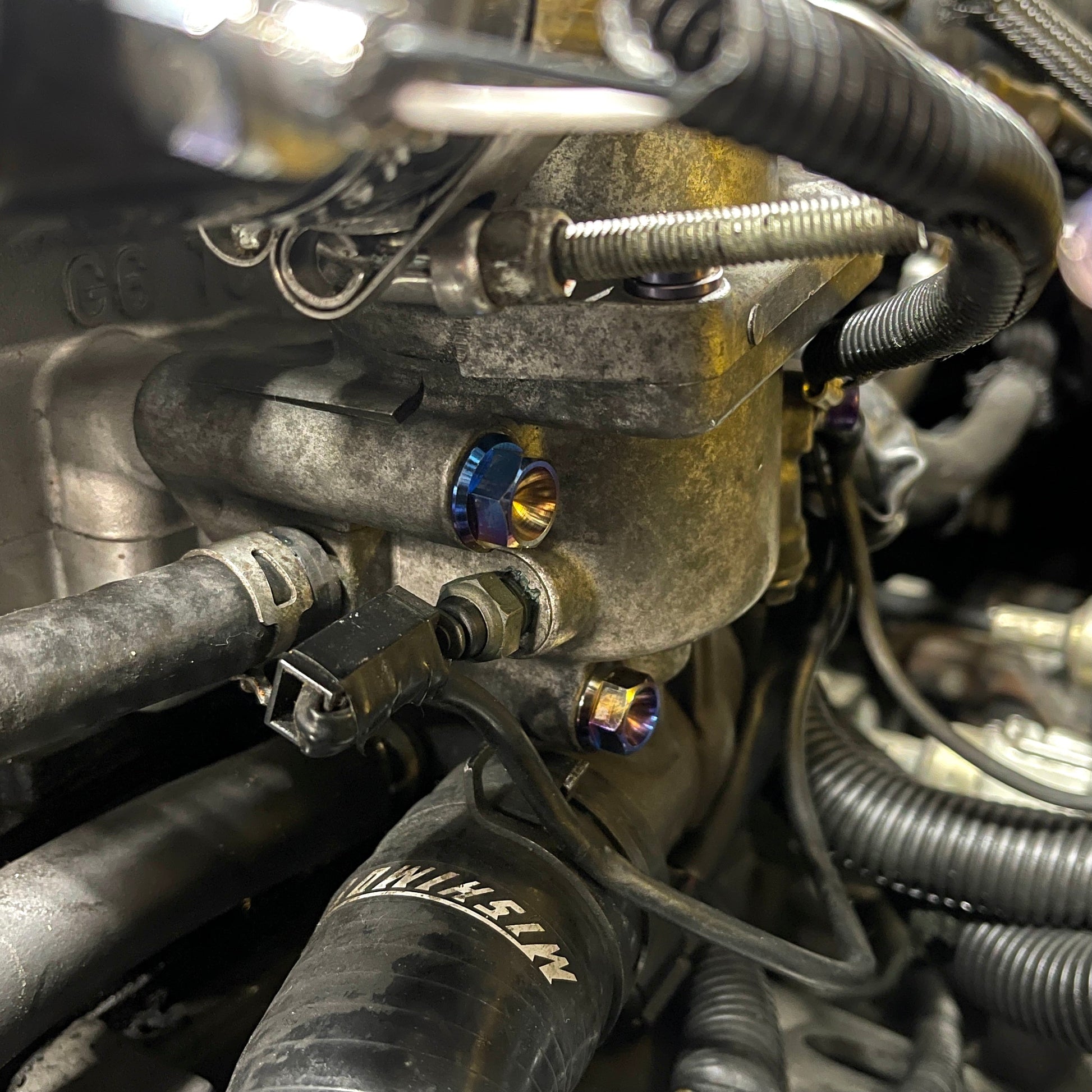 The JDC Titanium Thermostat Housing Replacement Hardware Kit replaces the worn-out hardware on your thermostat housing. We have hardware for the top thermostat bolts, as well as the lower bolts in the front that hold the thermostat housing to the head. Each piece of hardware is professionally CNC machined from a single piece of 6AL-4V Grade 5 Titanium and is available in multiple color options. Each piece is hand polished before receiving our proprietary cold anodizing treatment for vibrant colors that will last a lifetime!