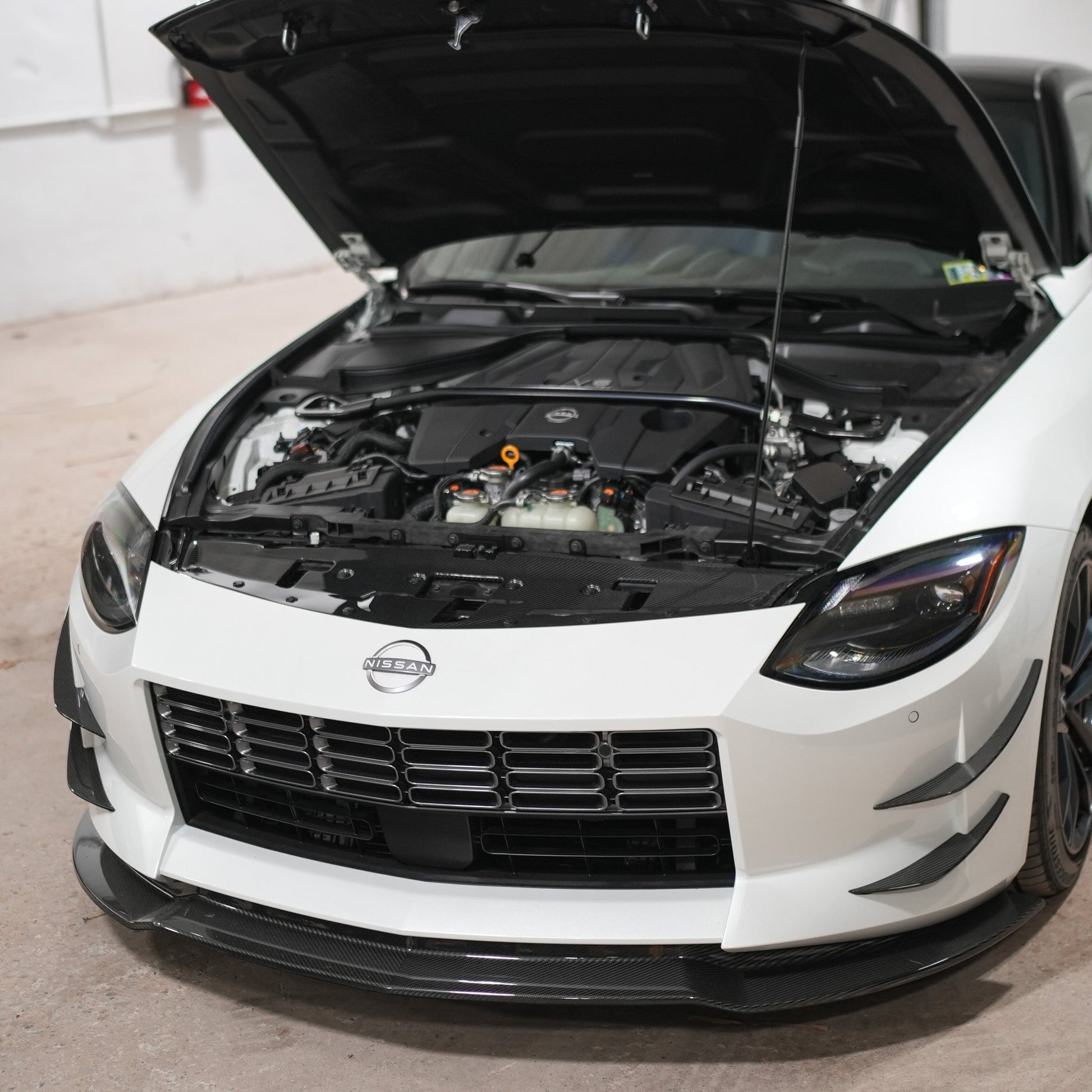 Engine Bay Enhancement: Elevate the visual appeal of your Nissan Z's engine bay with the sleek and modern design of the carbon fiber radiator shroud. The shroud adds a high-performance flair while complementing the overall styling of your vehicle.