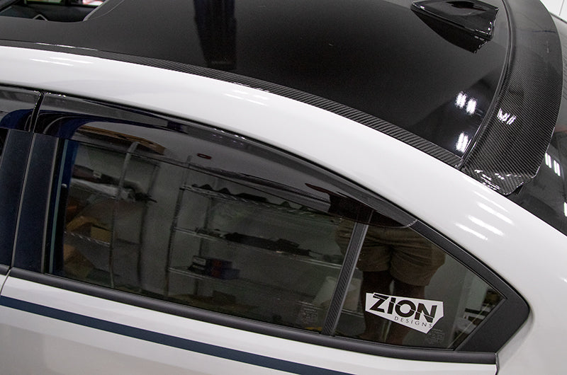- Black carbon fiber roof moldings feature 3M adhesive tape for simple installation.