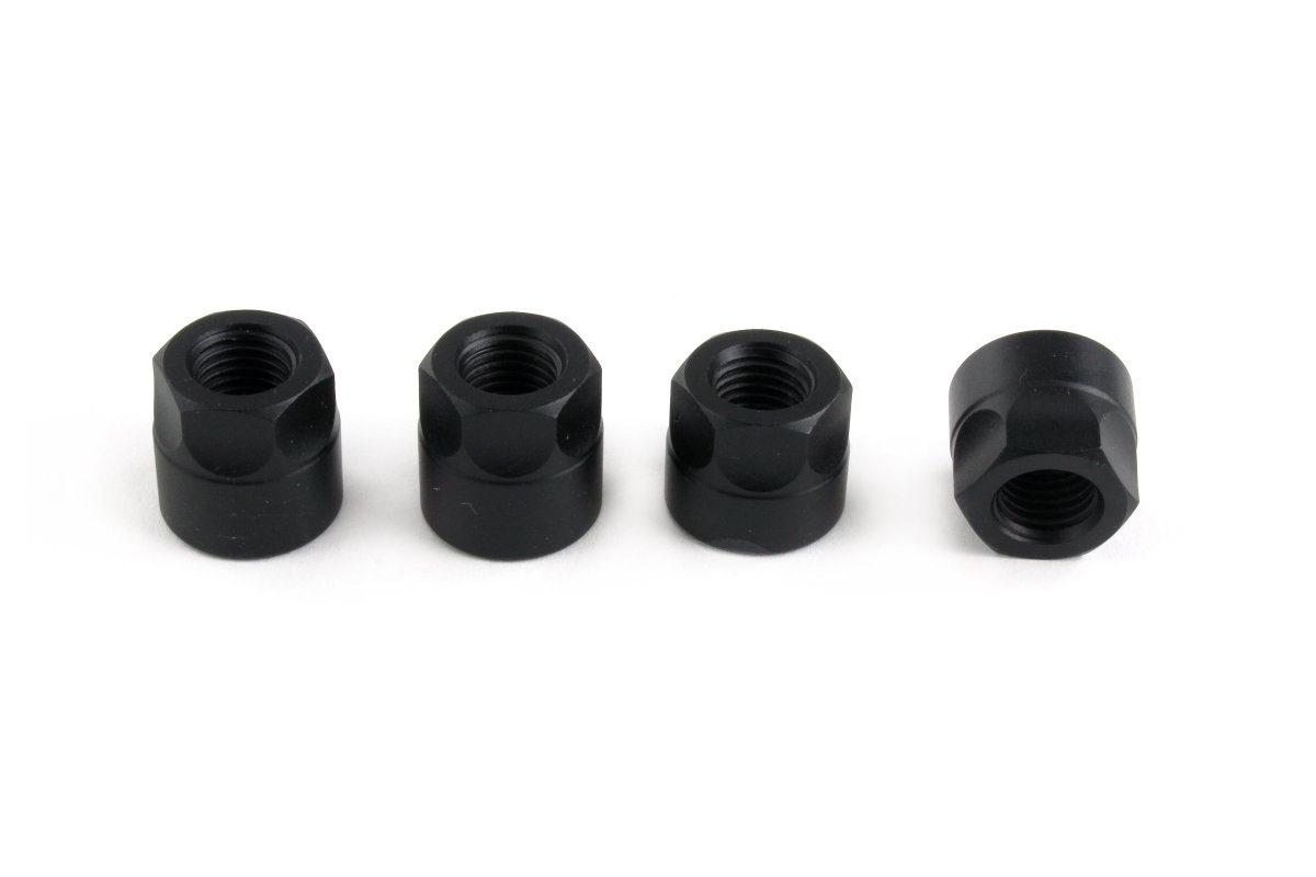 The feet are two-piece assemblies made from machined aluminum and anodized black. The two pieces are held together around the strut bar with four anodized black bolts.