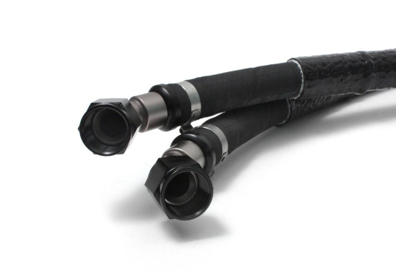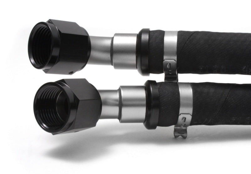 Hoses come with anodized aluminum hose ends which have been designed to fit without the need for clamps